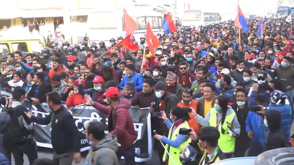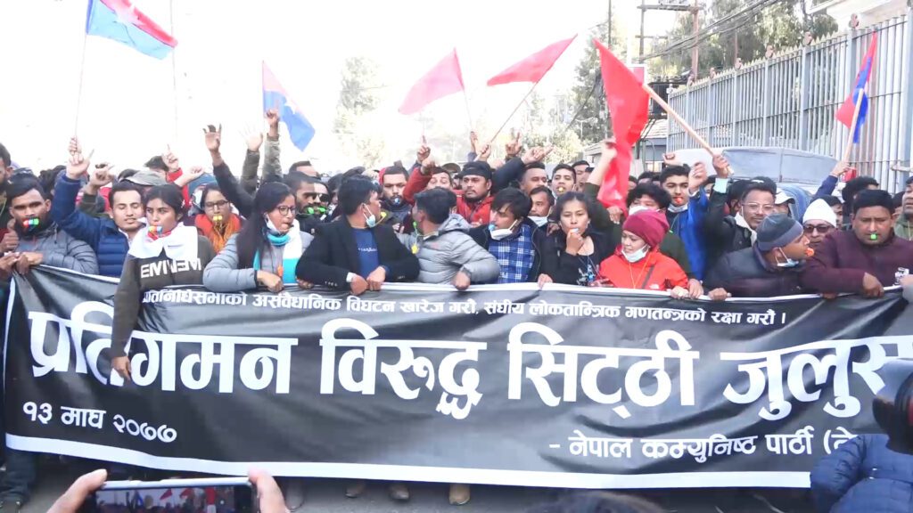 काठमाडौं, १३ माघ । संसद विघटनविरुद्ध चरणबद्ध आन्दोलन गरिरहेको नेकपा प्रचण्ड–माधव समूहले मंगलबार काठमाडौंमा सिठ्ठी जुलुस निकालेको छ ।