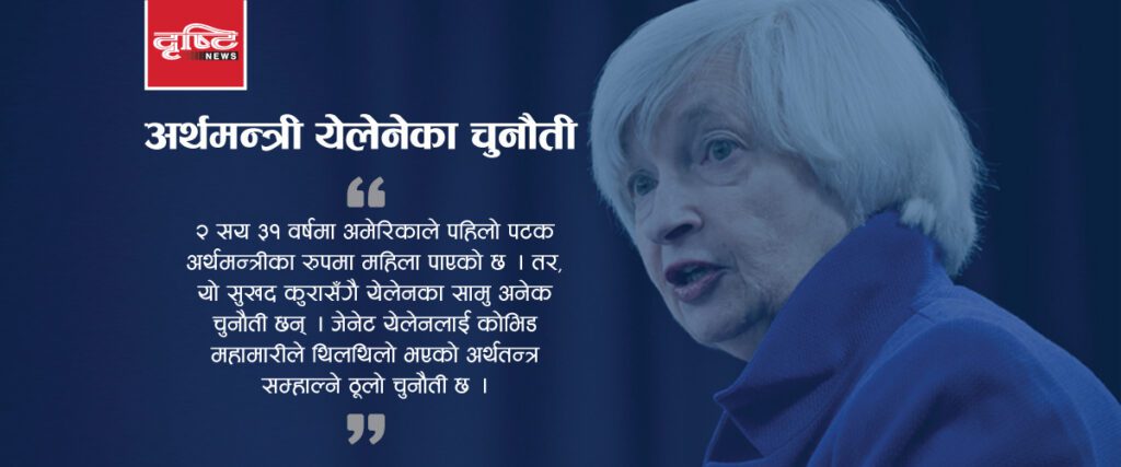 २ सय ३१ वर्षमा अमेरिकाले पहिलो पटक अर्थमन्त्रीका रुपमा महिला पाएको छ । तर, यो सुखद कुरासँगै येलेनका सामु अनेक चुनौती छन् । जेनेट येलेनलाई कोभिड महामारीले थिलथिलो भएको अर्थतन्त्र सम्हाल्ने ठूलो चुनौती ।