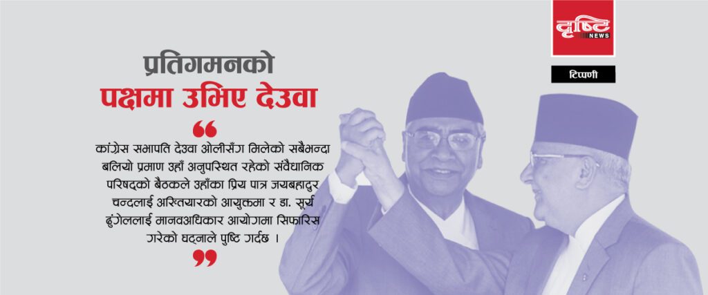 कांग्रेस सभापति देउवा ओलीसँग मिलेको सबैभन्दा बलियो प्रमाण उहाँ अनुपस्थित रहेको संवैधानिक परिषद्को बैठकले उहाँका प्रिय पात्र जयबहादुर चन्दलाई अख्तियारको आयुक्तमा र डा. सूर्य ढुंगेललाई मानवअधिकार आयोगमा सिफारिस गरेको घट्नाले पनि पुष्टि गर्दछ ।