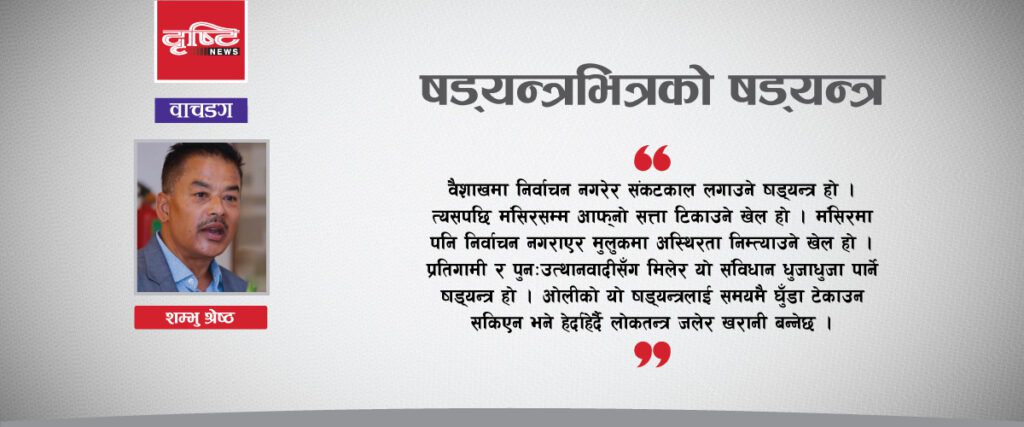 वैशाखमा निर्वाचन नगरेर संकटकाल लगाउने षड्यन्त्र हो । त्यसपछि मंसिरसम्म आफ्नो सत्ता टिकाउने खेल हो । मंसिरमा पनि निर्वाचन नगराएर मुलुकमा अस्थिरता निम्त्याउने खेल हो । प्रतिगामी र पुनःउत्थानवादीसँग मिलेर यो संविधान धुजाधुजा पार्ने षड्यन्त्र हो । ओलीको यो षड्यन्त्रलाई समयमै घुँडा टेकाउन सकिएन भने हेर्दाहेर्दै लोकतन्त्र जलेर खरानी बन्नेछ ।