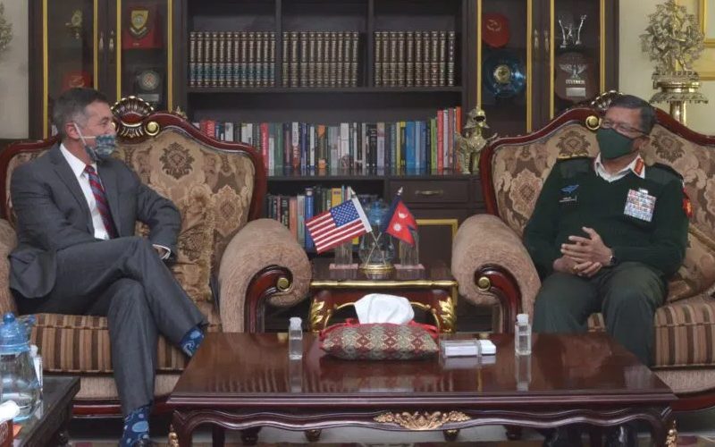काठमाडौं, १६ माघ । प्रधानसेनापति पूर्णचन्द्र थापा र अमेरिकी राजदूत र्याण्डी बेरीबीच भेटवार्ता भएको छ । सैनिक मुख्यालयमा शुक्रबार शिष्टाचार भेटघाट भएको हो । भेटमा दुई पक्षीय आपसी हित तथा पारस्परिक सम्बन्धका विषयमा छलफल भएको जनाइएको छ ।