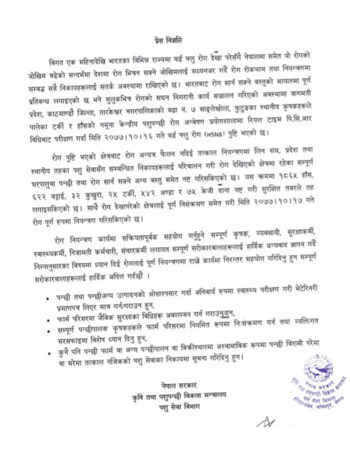 अपिलमा पन्छी तथा पन्छीजन्य उत्पादनको ओसारपसार गर्दा अनिवार्य रुपमा स्वास्थ्य परीक्षण गरी भेटेनरी प्रमाणपत्र लिनुपर्ने, फर्म परिसरमा जैविक सुरक्षाका विधिहरु अवलम्बन गर्नुपर्ने, फर्म आसपासमा नियमित रुपमा निःसंक्रमण तथा व्यक्तिगत सरसफाईमा ध्यान दिनुपर्ने र अस्वभाविक रुपमा पन्छी विरामी परे वा मरेमा तत्काल नजिकको पशु सेवा कार्यालयमा सूचना दिनुपर्ने भनिएको छ ।