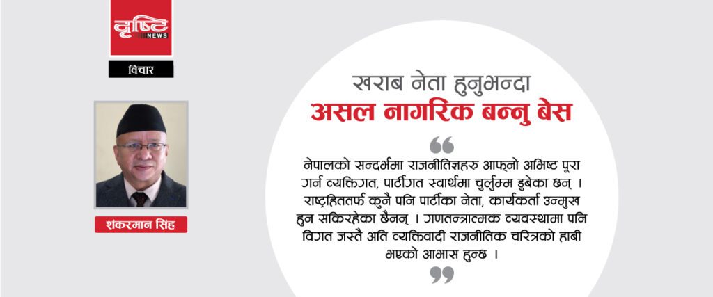 नेपालको सन्दर्भमा राजनीतिज्ञहरु आफ्नो अभिष्ट पूरा गर्नका व्यक्तिगत, पार्टीगत स्वार्थमा चुर्लुम्म डुबेका छन् । राष्ट्रहिततर्फ कुनै पनि पार्टीका नेता, कार्यकर्ता उन्मुख हुन सकिरहेका छैनन् । गणतन्त्रात्मक व्यवस्थामा पनि विगतमा जस्तै अति व्यक्तिवादी राजनीतिक चरित्रको सिकार भएको आभास देखिन्छ ।
