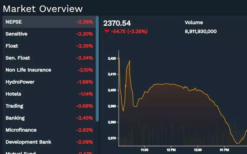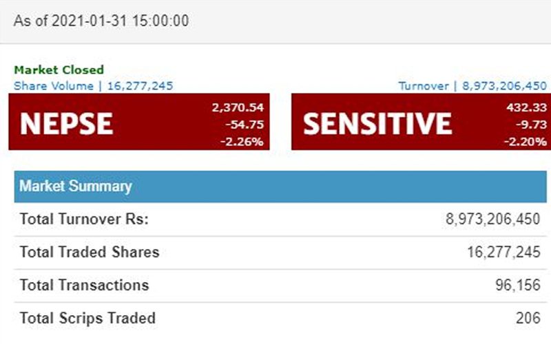 काठमाडौं, १८ माघ । साताको पहिलो दिन आज (आइतबार) नेप्से परिसूचक ५४ दशमलव ७५ अंकले घटेको छ । शेयर बजार २ दशमलव २६ प्रतिशतले घटेर २ हजार ३ सय ७० दशमलव ५४ विन्दुमा पुगेर बन्द भएको हो ।