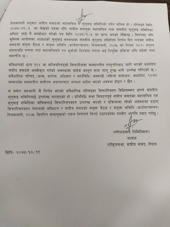 तर ५ पुसमा प्रतिनिधिसभा भंग गरेसँगै अख्तियार, निर्वाचन आयोग लगायतका संवैधानिक अंगहरुमा नियुक्ति सिफारिस गरेको भन्दै संसद सचिवालयमा पत्र पुगेको थियो । त्यो पत्र सभामुख सापकोटाले आइतबार संवैधानिक परिषद्मै फिर्ता पठाएका थिए ।