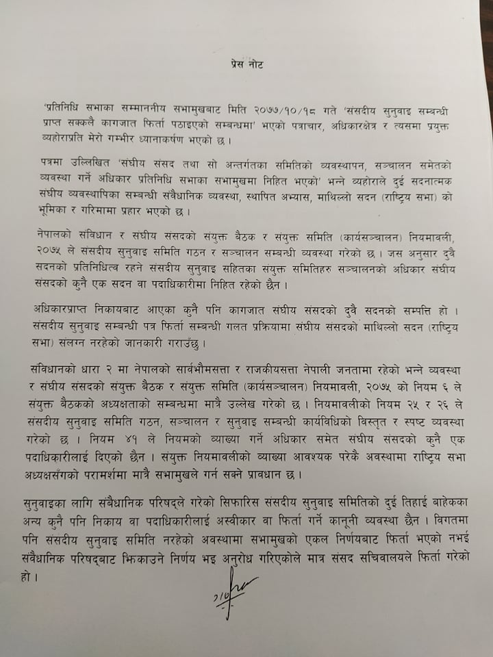 अध्यक्ष तिमिल्सिनाले अधिकारप्राप्त निकायबाट आएका कुनै पनि कागजात संघीय संसद्को दुवै सदनको सम्पत्ति भएको बताए । अध्यक्ष तिमिल्सिनाद्वारा जारी प्रेस नोटमा भनिएको छ,’संविधानको धारा २ मा नेपालको सार्वभौमसत्ता र राजकीयसत्ता नेपाली जनतामा रहेको भन्ने व्यवस्था र संघीय संसद्को संयुक्त बैठक र संयुक्त समिति कार्यसञ्चालन नियमावली २०७५ को नियम ६ संयुक्त बैठकको अध्यक्षताको सम्बन्ध मात्र उल्लेख गरेको छ । नियमावलीको नियम २५ र २६ ले संसदीय सुनुवाई समिति गठन सञ्चालन र सुनुवाइ सम्बन्धी कार्यविधि विस्तृत र स्पष्ट व्यवस्था गरेको छ । नियम ४१ले नियमको व्याख्या गर्ने अधिकारसमेत संघीय संसद्को कुनै एक पदाधिकारीलाई दिएको छैन । उक्त नियमावलीको व्याख्या आवश्यक परेको अवस्थामा राष्ट्रिय सभाध्यक्षसँग परामर्शमा मात्रै सभामुखले गर्न सक्ने प्रावधान छ ।’