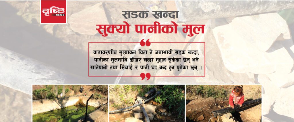 देश संघीयतामा गएको ३ वर्ष भयो । यो अवधिमा स्थानीय सरकारबीच हरेक ग्रामीण क्षेत्रमा सडक पुर्याउने होडबाजी चल्यो । तर, वातावरणीय मूल्याङ्कन बिना खनिएका सडकले स्थानीयलाई सहज हुनुको साटो उल्टै गाउँमा संकट निम्त्याइदियो । अहिले गाउँमा पानीको मुहान सुक्दै जाँदा खानेपानी, सिँचाइ तथा पानीघट्ट बन्द भए ।