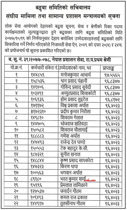 बढुवा समितिले निजामतीका २२ उपसचिवको सहसचिवमा बढुवा सिफारिस गरेको छ । कार्यक्षमताको मूल्याङकनको आधारमा हुने बढुवाका लागि नाम सिफारिस भएको हो ।