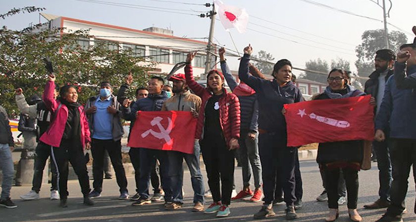 काठमाडौं, २१ माघ । नेपाल कम्युनिष्ट पार्टी (नेकपा) प्रचण्ड-माधव समूहका विद्यार्थीहरुले काठमाडौंको नयाँ वानेश्वर सडक चक्काजाम गरेका छन् । प्रधानमन्त्री केपी शर्मा ओलीको सिफारिसमा राष्ट्रपति विद्यादेवी भण्डारीले असंवैधानिकरुपमा प्रतिनिधिसभा विघटन गरेको भन्दै सत्तारुढ दल नेकपा प्रचण्ड-माधव समूह यतिबेला सडक आन्दोलनमा छन् ।