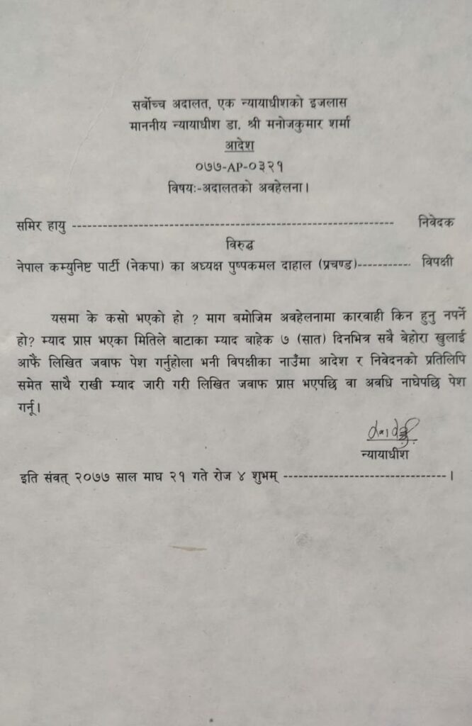 काठमाडौं, २१ माघ । नेपाल कम्युनिस्ट पार्टी (नेकपा)का अध्यक्ष पुष्पकमल दाहाल ‘प्रचण्ड’लाई सात दिनभित्र लिखित जवाफसहित उपस्थित हुन सर्वोच्चले अदालतले आदेश दिएको छ ।