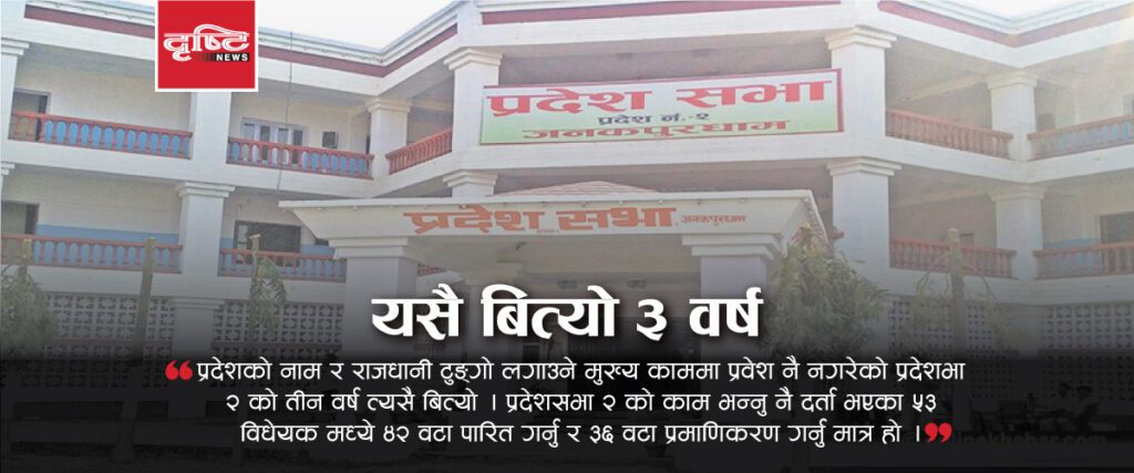धनुषा, २१ माघ । माघ २१ गते प्रदेश २ प्रदेशसभा गठन भएको तीन वर्ष पुरा भयो । सुरुवाती चरणमा तीव्र गतिमा कानून निर्माण लगायतका काम भएपनि पछिल्लो संसद अधिवेशन त्यसै बित्यो ।पहिलो वर्ष सत्तापक्ष र प्रतिपक्षी दलको विवाद, दोस्रो वर्ष उपभोक्ताको भुक्तानी विवादमा प्रदेशसभाले समय व्यतित गर्यो । तेस्रो वर्ष प्रदेशको राजधानी र नाम टुङ्गो लगाउने प्रयास भए पनि प्रदेश २ ले नाम र राजधानी पाउन सकेन ।