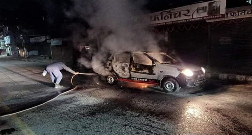 कालो ज्याकेट लगाएर आएका दुई जनाले ट्याक्सीमा आगजनी गरेर भागेका उनले बताए । सरकारले संविधानलाई बेवास्ता गर्दै संवैधानिक निकायहरुमा नियुक्ति गरेको भन्दै त्यसको विरोधमा बिहीबार देशव्यापी नेकपा प्रचण्ड–नेपाल समुहले आम हड्ताल घोषणा गरेको छ ।