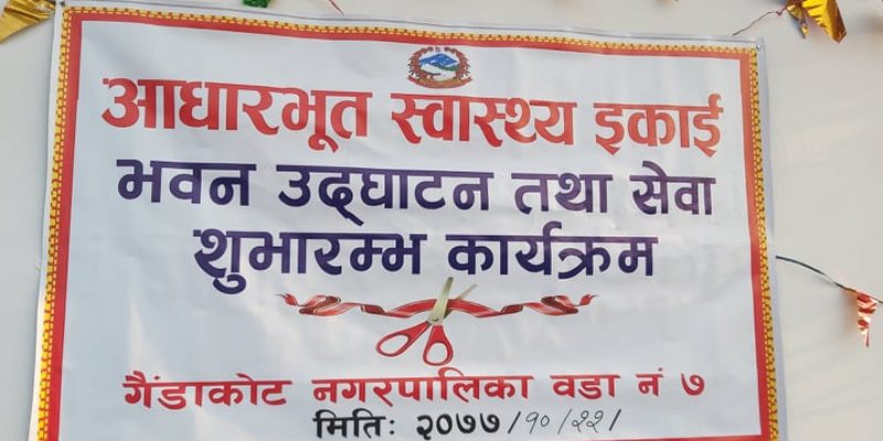 नवलपुर, २२ माघ । नवलपुरको गैंडाकोट नगरपालिकाको वडा नं. ७ मा निर्माण भएको आधारभूत स्वास्थ्य इकाई भवनको उद्घाटन भएको छ । संघीय सरकारको ३८ लाख लागतमा बनेको स्वास्थ्य ईकाई भवनको उद्घाटन पश्चात बिहीबारदेखि नै सेवा समेत शुभारम्भ भएको हो ।