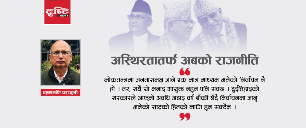 लोकतन्त्रमा जनतासमक्ष जाने एक मात्र माध्यम भनेको निर्वाचन नै हो । तर, सधैँ यो भनाइ उपयुक्त नहुन पनि सक्छ । दुईतिहाइको सरकारले आफ्नो अवधि अढाइ वर्ष बाँकी छँदै निर्वाचनमा जानु भनेको राष्ट्रको हितको लागि हुन सक्दैन ।