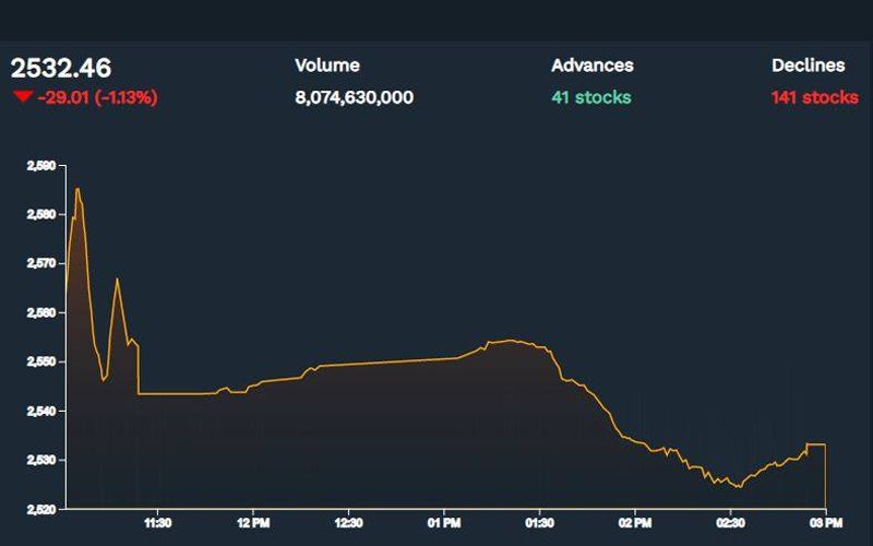 लगातार उकालो लागेको बजारले मंगलबार पनि सुरुआती समयमा २ हजार ५ सय ८५ अंकसम्मको उचाई छोएर घट्न सुरु भएको थियो । घट्नेक्रममा अधिकतम २ हजार ५ सय २४ अंकसम्म ओर्लिए पनि नियमित कारोबार समयको अन्त्यतिर केही सुधार हुँदा २ हजार ५ सय ३४ अंकमा रोकिएको छ ।