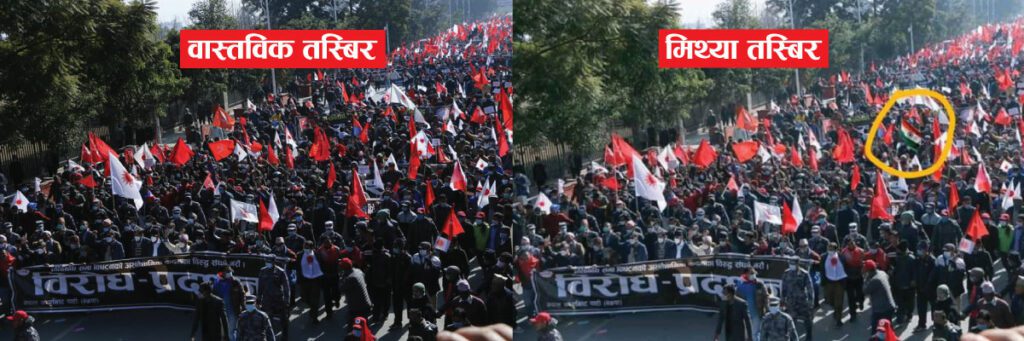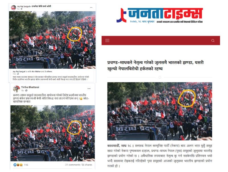 २९ डिसेम्बर २०२० मा प्रचण्डको आधिकरिक फेसबुक पेजमा पोष्ट भएको र्यालीको तस्बिर फोटोसप गरी भारतीय झण्डा टाँसिएको रहेछ । यसबारे संचार माध्यम तथा सामाजिक संजालमा भाइरल हुने सामग्रीको तथ्यजाँच गर्दै आएको ‘नेपाल फ्क्ट चेक’ले तथ्यजाँच गरेको छ । तथ्यजाँचले भन्छ– ‘पुरानो फोटोमा भारतीय झण्डा टाँसेर भाइरल बनाइयो ।’