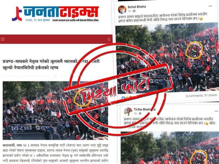 ‘नेपाल फ्क्ट चेक’ले तथ्यजाँचपछि मिथ्या फोटो भन्दै बनाएको ‘कभर’ तस्बिर हेरौं ।