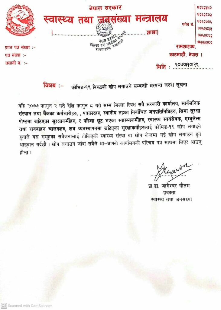 फागुन २ गतेदेखि ८ गतेसम्म जिल्लास्थित सबै सरकारी कार्यालय, सार्वजनिक संस्थान, बैंकका कर्मचारीलाई खोप दिईने भएको
