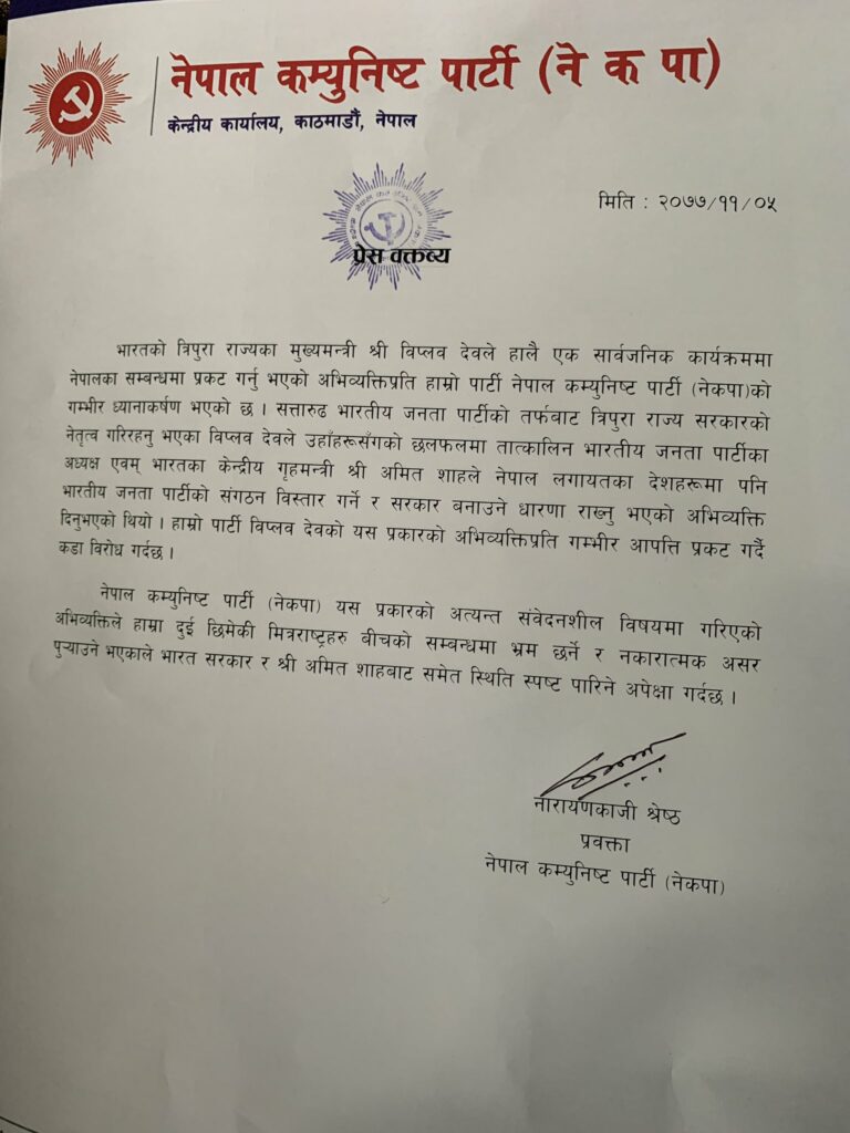 प्रवक्ता श्रेष्ठद्वारा जारी विज्ञपित्मा भनिएको छ– ‘भारतीय गृहमन्त्री अमित शाहले नेपाल लगायतका देशहरुमा पनि भारतीय जनता पार्टीको संगठन विस्तार गर्ने र सरकार बनाउने धारणा राख्नु भएको अभिव्यक्ति दिनुभएको थियो, हाम्रो पार्टी विप्लव देवको अभिव्यक्तिप्रति गम्भीर आपत्ति प्रकट गर्दै कडा विरोध गर्दछ।’