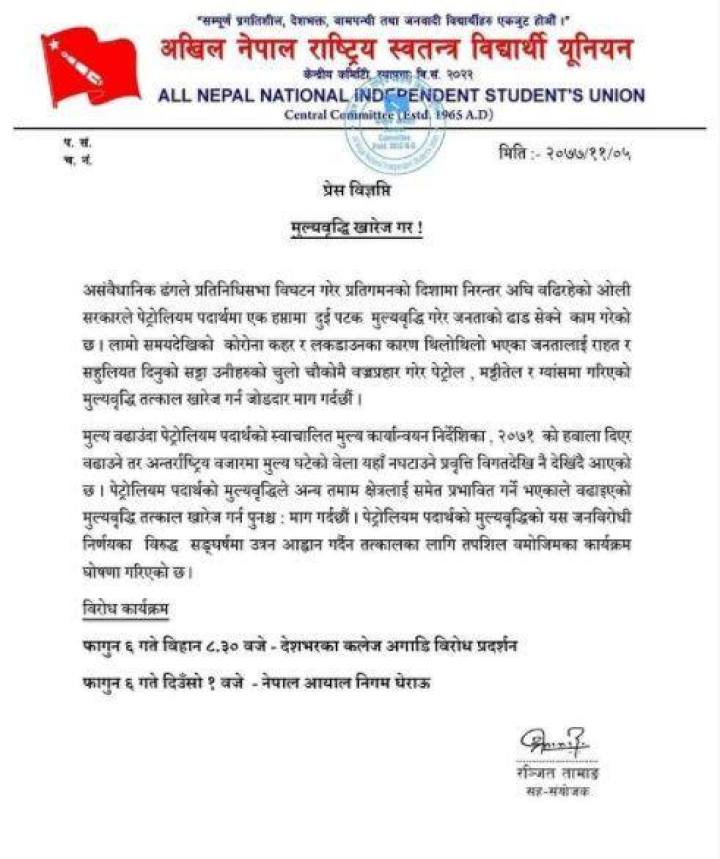 अनेरास्ववियूले सरकारले जनताको ढाड सेक्ने काम गरेको भन्दै बिहीबार बिहान साढे ८ बजे देशभरका क्याम्पस अगाडि प्रदर्शन गर्ने र ११ बजे नेपाल आयल निगम घेराउ गरी निगममा ज्ञापन पत्र बुझाउने भएको हो ।