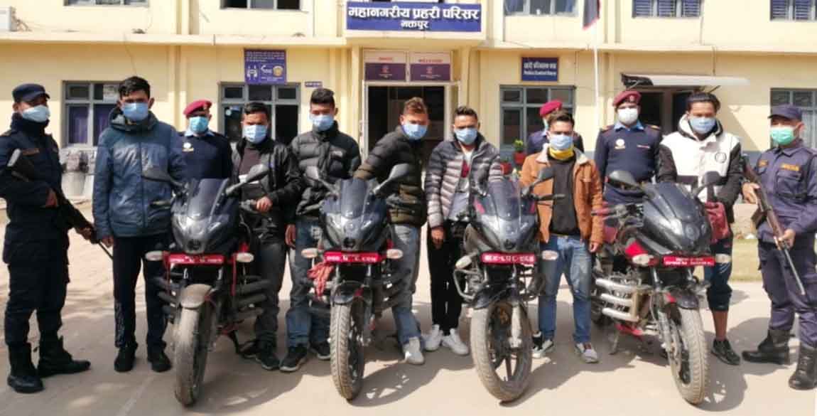 यसैगरी माघ ४ गते राति भक्तपुर भक्तपुर नगरपालिका–७ स्थित आदर्शचोकमा जाँच गर्ने क्रममा बा९ प ८९६४ नम्बरको हरिगोविन्द शिल्पकारको नाममा रहेको मोटरसाइकल चोरी गरी लैजाँदै गरेको अवस्थामा २ जनालाई प्रहरीले पक्राउ गरेको छ ।