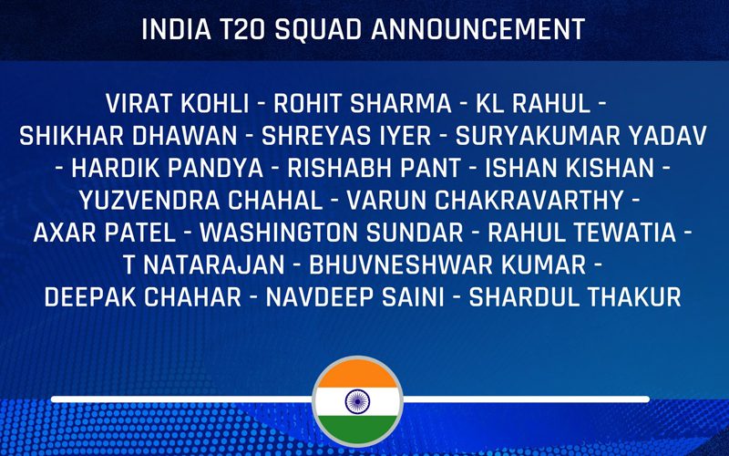 उनीहरुले २०२० को आईपीएलमा उत्कृष्ट प्रदर्शन गरेका थिए । यस्तै टिममा रोहित शर्मा, भुवनेश्वर कुमार, ऋषव पन्त र वरुण चक्रवर्ती टिममा फर्किएका छन् ।