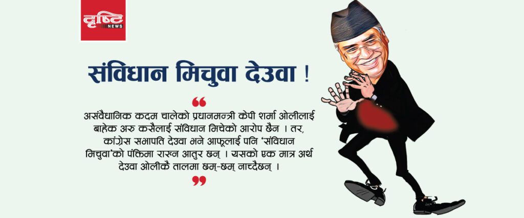 देउवा संविधान मिचुवा हुन् भन्नलाई यो भन्दा ठूलो आधार केहि हुँदैन । यसको एक मात्र कारण भनेको आफूलाई पनि ओली संँगै उभ्याउन हरपल आतुर छन्, देउवा । नीतिगत भ्रष्टाचारमा देउवाको पनि भाग छुट्याइएको, प्रमुख प्रतिपक्ष भएता पनि नेता कार्यकर्तालाई सरकारले गरेका गलत कामको विरोध गर्न नदिएको, असंवैधानिक रुपमा संवैधानिक परिषद्को पदाधिकारी सिफारिस हुँदा देउवा निकट व्यक्तिको नाम पर्नुले देउवा र ओलीको साँठगाँठ छ भन्ने कतै लुक्दैन ।