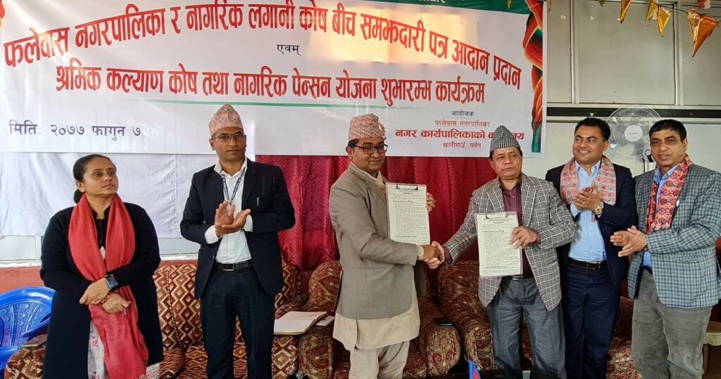 काठमाडौं । पर्वतको फलेवास नगरपालिकाका असंगठित क्षेत्रका बिपन्न मजदुरको ५ सय रुपैया योगदान तथा नगरपालिकाद्वारा ५ सय रुपैयाँ थप गरी मासिक १ हजार रुपैयाको दरले प्रति महिना रकम जम्मा गर्ने गरी नागरिक लगानी कोष र फलेवास नगरपालिकाबीच सम्झौता भएको छ ।