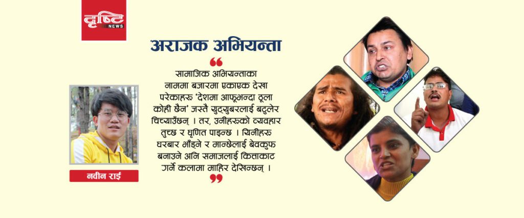 सामाजिक अभियन्ताका नाममा बजारमा एकाएक देखा परेकाहरू ‘देशमा आफूभन्दा ठूला कोही छैन’ जस्तै यु–ट्युबरलाई बटुलेर चिच्याउँछन् । तर, उनीहरूको व्यवहार तुच्छ र घृणित पाइन्छ ।