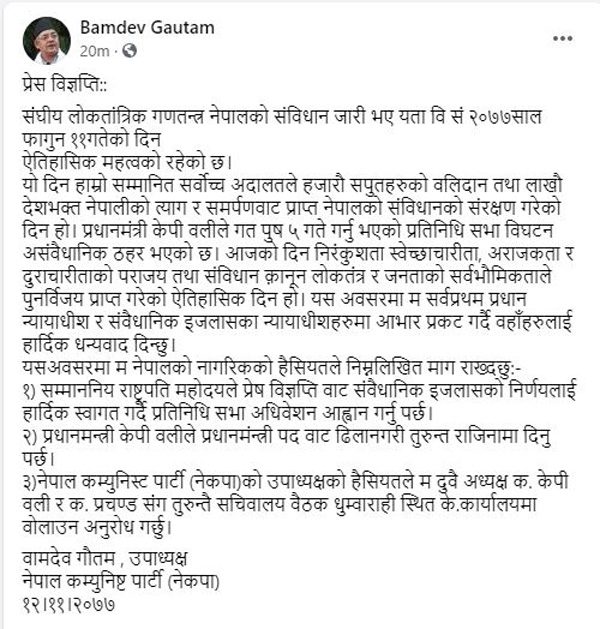 प्रतिनिधिसभा विघटन बदर भएपछिको परिस्थितिबारे छलफल गर्न गौतमले बैठक बोलाउन आवश्यक रहेको उल्लेख गरेका छन् । गौतमले जारी गरेको विज्ञप्तीमा भनिएको छ, ‘नेपाल कम्युनिष्ट पार्टी (नेकपा) को उपाध्यक्षको हैसियतले म दुवै अध्यक्ष क. केपी शर्मा ओली र क. प्रचण्डसँग तुरुन्तै सचिवालय बैठक धुम्वाराहीस्थित पार्टीको केन्द्रीय कार्यालयमा बोलाउन अनुरोध गर्छु ।’