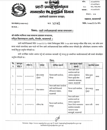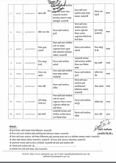 सरुवा अनुसार बर्दियामा ईश्वर कार्की, गुल्मीमा गोपालचन्द्र भट्टराई, बाग्लुङमा कृष्णबहादुर पल्लीमगर, महोत्तरीमा दिनेश आचार्य र गोरखामा शेखर खनाललाई पठाइएको छ । बाग्लुङका लोकेन्द्र श्रेष्ठ र गोरखाका गुरेन्द्र गुरुङलाई कारबाहीस्वरुप हटाएर नयाँ एसपी पठाइएको छ ।