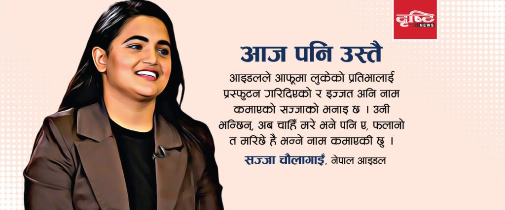 उनी अर्थात सज्जा चौलागाईं । हिजोसम्म सज्जा आफ्ना साथीसंगी र आफन्तमा मात्रै परिचित थिइन् । अहिले दुनियाँसामु चिनिन्छिन् । नेपाल आइडल सिजन–३ विजेता बनेसँगै सज्जा र नेपाल आइडल पर्यायवाची जस्तै बन्यो ।