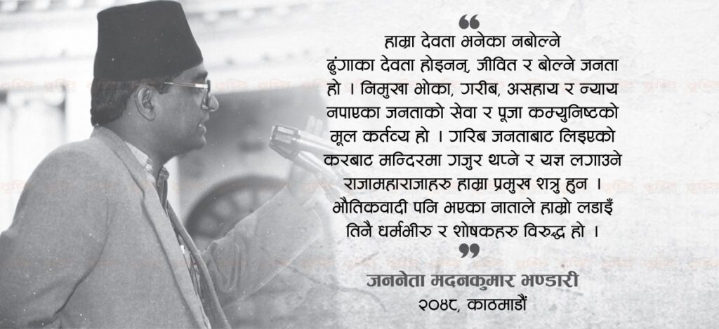 यो भनाइ जननेता मदन भण्डारीका हुन् । नेपाली राजनीतिमा आशाका किरण बनेर उदाएका मदन भण्डारीले छोटो समयमै आफ्नो राजनीतिक उचाइ कायम गरेका थिए । ‘सादा जीवन उच्च विचार’का धनी मदन भण्डारी इतिहास रच्ने नेता हुन्, जसले कम्युनिष्ट आन्दोलनलाई जनताको ‘बहुदलीय जनवाद’मार्फत नयाँ जीवन दिए ।