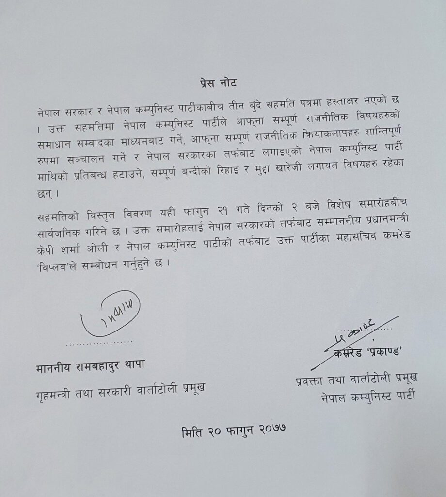 काठमाडौं । प्रतिबन्धित नेपाल कम्युनिस्ट पार्टी (नेकपा) विप्लव समूह र सरकारबीच तीन बुँदे सहमति भएको छ ।