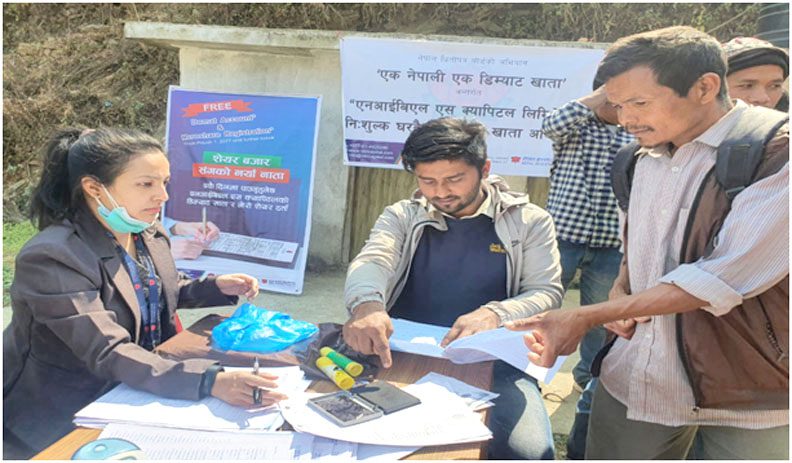काठमाडौं । नेपाल धितोपत्र बोर्डको अभियान ‘एक नेपाली एक डिम्याट खाता’अन्तर्गत एनआईबिएल एस क्यापिटल लिमिटेडले निःशुल्क घरदैलो डिम्याट खाता अभियान ललितपुरको घुसेल बागमती गाउँपालिका वडा नं १ मा फागुन २० गते सम्पन्न गरेको छ ।