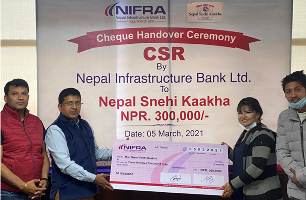 कठमाडौं । नेपाल इन्फ्रास्ट्रक्चर बैंक (निफ्रा) स्थापनाको तेस्रो वर्षमा प्रवेश भएको छ । सो अवसरमा बैंकले नेपाल स्नेही काखलाई तीन लाख रुपैयाँ हस्तान्तरण गरेको छ ।