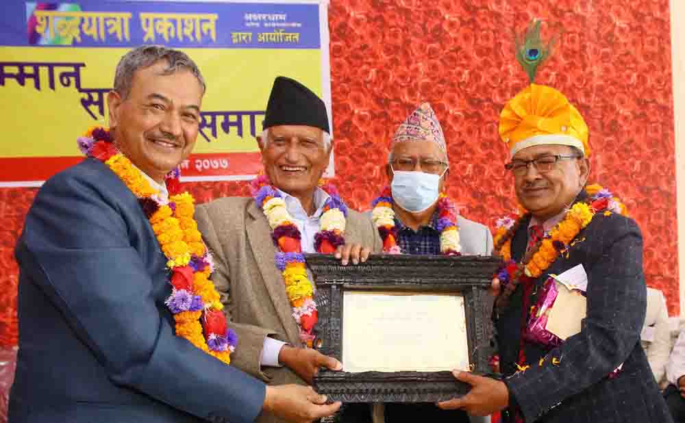 बनेपा । शब्दयात्रा प्रकाशनबाट हरेक वर्ष विभिन्न विधाकाहरुलाई समाहित गरी सम्मान गर्दै आएको छ । वर्षको दुई पटक सम्मान गर्दै आएकामा यसपटक कोभिडका कारण एकमुष्ठ १८ विधाका व्यक्तित्वलाई सम्मान गरेको छ ।