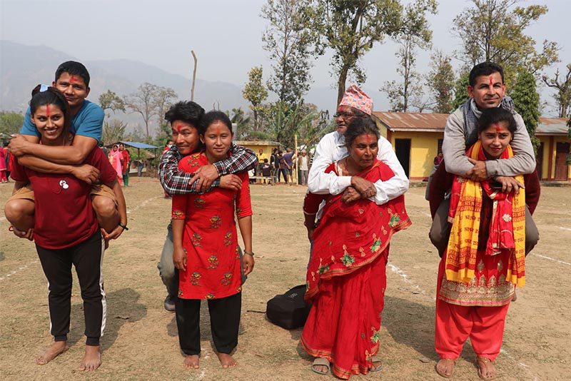 महिलाहरुको साहसकिता प्रदर्शन गर्न उद्देश्यले श्रीमतीले श्रीमानलाई बोकेर दौडिने प्रतियोगिता आयोजना गरिएको गाउँपालिकाका अध्यक्ष दुर्गाबहादुर थापाले जानकारी दिए।