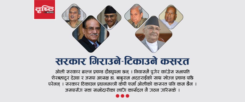 ओली सरकार ढाल्न प्रचण्ड दौडधुपमा छन् । निवासमै पुगेर कांगे्रस सभापति शेरबहादुर देउवा र जसपा अध्यक्ष डा. बाबुराम भट्टराईको साथ खोज्न प्रचण्ड पछि परेनन् । सरकार टिकाउन प्रधानमन्त्री केपी शर्मा ओलीको कसरत पनि कम छैन । जसपासँग सत्ता साझेदारीका लागि कार्यदल नै गठन गरिसके ।