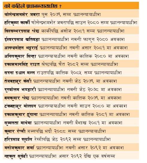 काठमाडौं । सर्वोच्च अदालतमा आगामी १५ वर्षसम्म बन्ने प्रधानन्यायाधीशको नाम सिफारिस गरिएको छ । प्रधानन्यायाधीश चोलेन्द्र शमशेर राणाको अध्यक्षतामा बसेको न्याय परिषद् बैठकले २०९२ सालसम्म सर्वोच्चमा प्रधानन्यायाधीश बन्ने रोलक्रम राखिएको छ । यसअघि नियुक्त भएका पाँच न्यायाधीश अब प्रधानन्यायाधीश बन्ने रोल क्रममा छन् ।