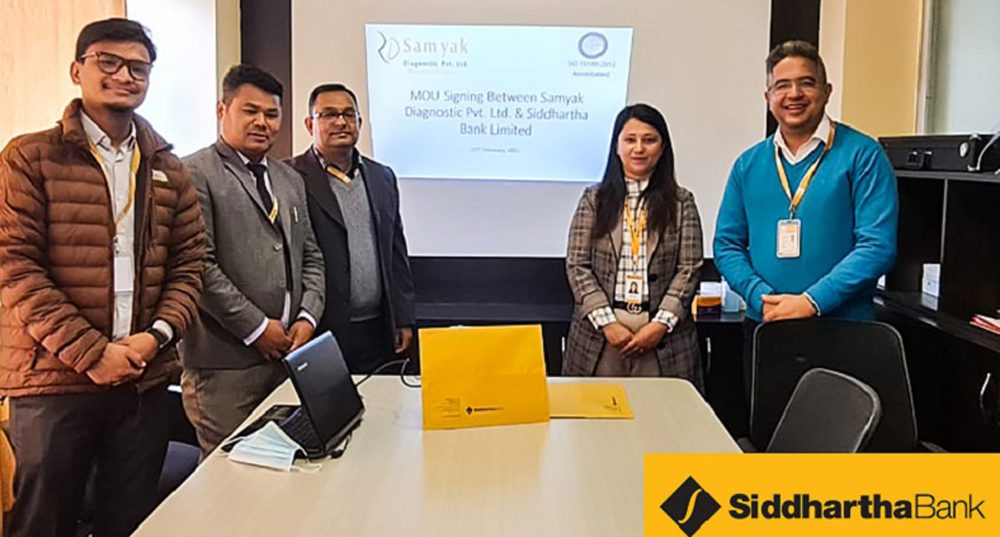 काठमाडौं । सिद्धार्थ बैंक लिमिटेड र ललितपुरको जावलाखेलस्थित सम्यक डाइग्नोस्टिक प्रालिबीच बैंकका ग्राहक महानुभावका लागि विभिन्न सेवामा छुट प्रदान गर्नेसम्बन्धी सम्झौता भएको छ ।