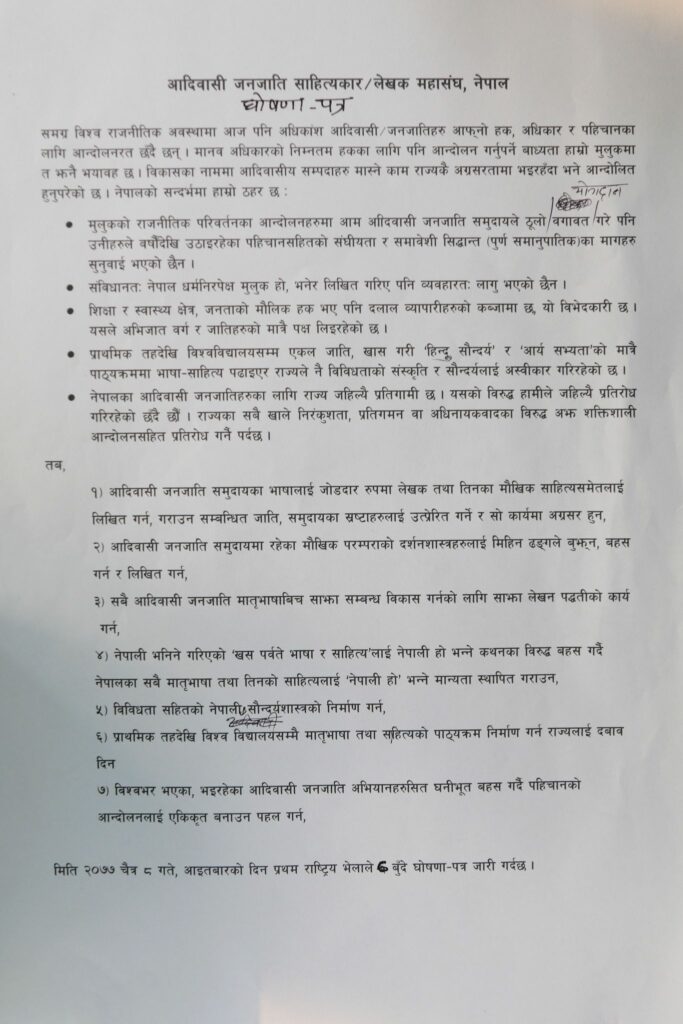 भेलाको दोस्रो दिन चैत्र ८ गते, आइतबार महासंघको केन्द्रीय कार्यसमिति गठन भएसँगै महासंघको ७ बुँदे घोषणापत्र पनि जारी भएको छ । आदिवासी जनजाति समुदायले वर्षौँदेखि उठाइरहेका मागहरु सुनुवाई नभएको ठहर गर्दै महासंघले आफ्नो घोषणापत्र जारी गरेको हो ।