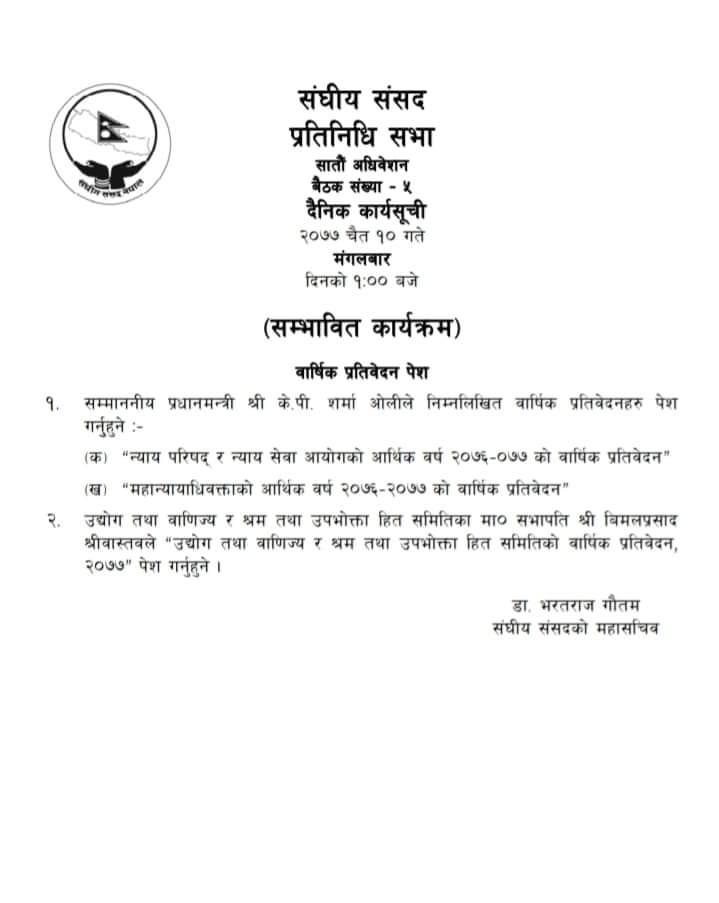 प्रधानमन्त्री केपी शर्मा ओलीले न्याय परिषद् र न्याय सेवा आयोगको प्रतिवेदन तथा महान्यायाधीवक्ता कार्यालयको आर्थिक वर्षको प्रतिवदेन पेस गर्ने संघीय संसद् सचिवालयले निकालेको सम्भावित कार्यक्रममा उल्लेख छ ।