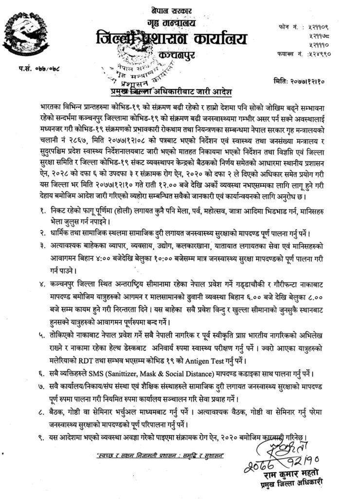 काठमाडाैं । कञ्चनपुरमा मंगलबार रातिदेखि लागू हुने गरी आंशिक रूपमा निषेधाज्ञा जारी गरिएको छ। भारतका विभिन्न प्रान्तमा बढिरहेको कोरोना भाइरसको संक्रमणको लहर नेपाल भित्रिने जोखिम रहेको भन्दै कञ्चनपुर प्रमुख
