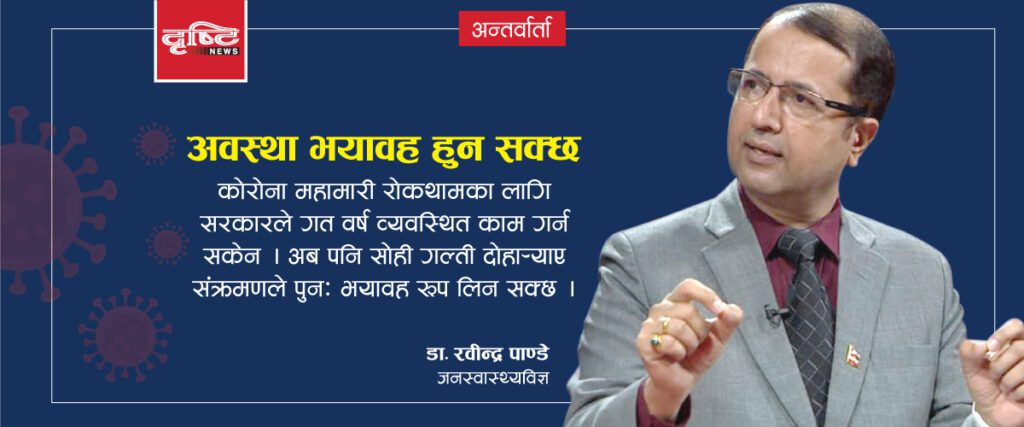 काठमाडाैं । भारतका विभिन्न जिल्लामा कोरोना भाइरसको संक्रमण बढेसँगै सीमा जोडिएको मुलुक नेपालमा पनि संक्रमणको जोखिम बढेको छ । नेपालमा पनि कोरोना भाइरसको जोखिम बढ्न सक्ने भन्दै सरकारले भीडभाड, सभा, सम्मेलन नगर्न आग्र्रह गरेको छ । सर्तकताका लागि स्वास्थ्य तथा जनसंख्या मन्त्रालयले मंगलबार मातहतका निकायलाई १० बुँदे निर्देशन दिएको छ । के नेपालमा पुनः कोरोना संक्रमण फैलन सक्छ ? रोक्न कसरी सकिन्छ ? विषयमा जनस्वास्थ्यविज्ञ रवीन्द्र पाण्डेसँग दृष्टिकर्मी प्रदीपराज दाहालले गरेको कुराकानी प्रस्तुत छ ।