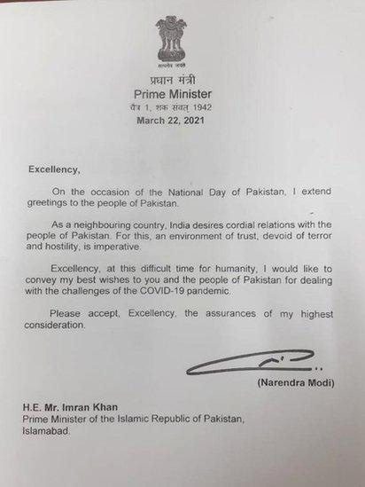 त्यस्तै भारतका राष्ट्रपति रामनाथ कोविन्दले पनि आफ्ना पाकिस्तानी समकक्षी आरिफ अल्वीको नाममा शुभकामना सन्देश पठाएका छन् । मोदीले पठाएको पत्रमा दुई देशको लाइन अफ कन्ट्रोल (नियन्त्रण रेखा) मा नयाँ शिराबाट युद्धविराम लागु भएको उल्लेख गरेका छन् ।