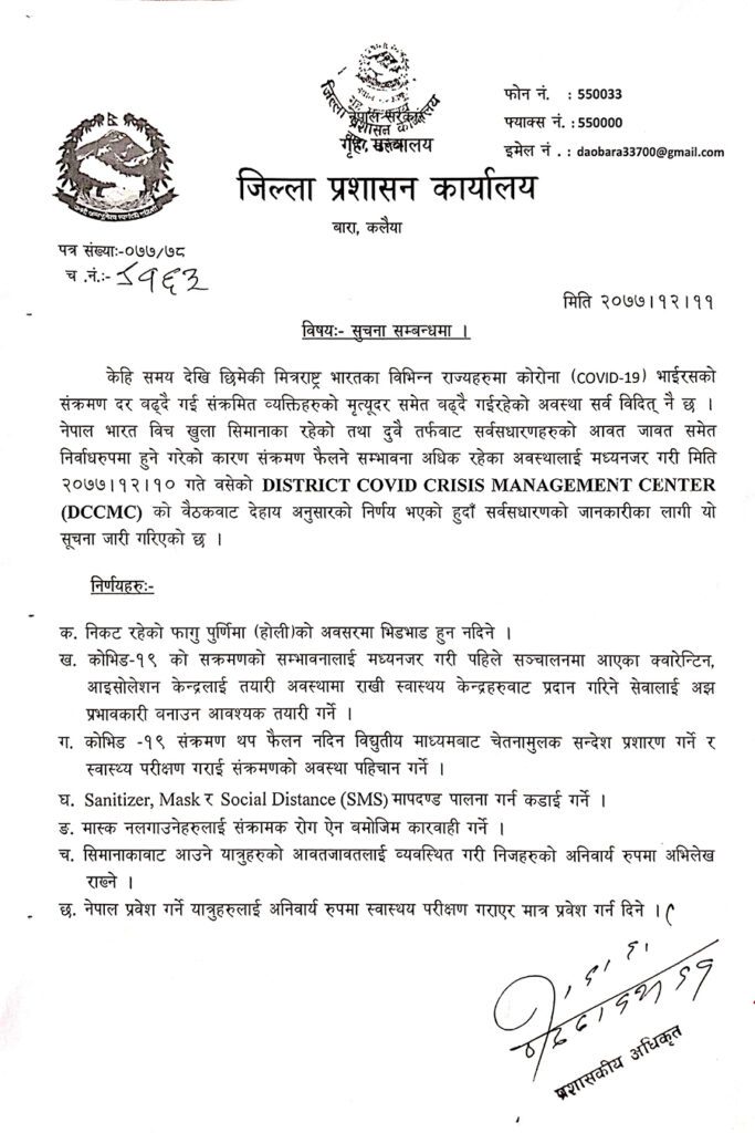 बारा । जिल्ला प्रशासन कार्यालय बाराले मास्क नलगाई घरबाहिर हिड्नेलाई कारबाही गर्ने भएको छ ।