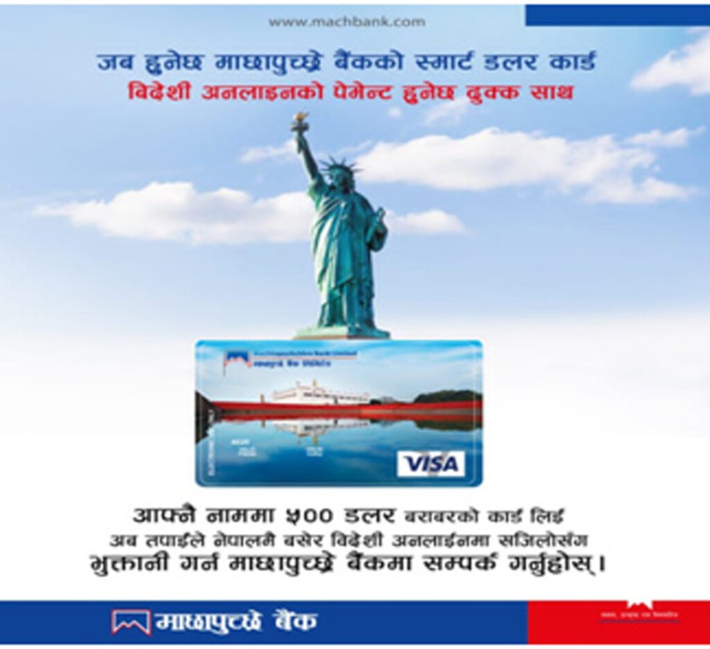 काठमाडौं । नेपाल राष्ट्र बैंकले हालै जारी गरेको अन्तर्राष्ट्रिय प्रिपेड कार्डसम्बन्धी परिपत्रअनुसार माछापुच्छ्रे बैंक लिमिटेडले एमबिएल स्मार्ट डलर कार्ड सञ्चालनमा ल्याएको छ । माछापुच्छ्रे बैंकमा खाता भएका ग्राहकले आफ्नो प्यान कार्ड पेस गरी अमेरिकी डलर ५०० बराबरको कार्ड प्राप्त गर्न सक्नेछन् ।