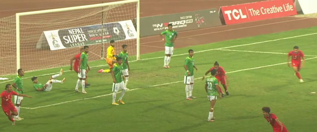 १७ औं मिनेटमा सुनील बलको पासमा अनन्त तामाङको हेडरलाई बंगलादेशका गोलकिपर अनिसुर रहमानले बचाए । १८ औं मिनेटमा सञ्जोग राईले गोल गर्दै टिमलाई अग्रता दिलाए । उनले राष्ट्रिय टिमबाट दोस्रो खेलमा नै गोल गर्न सफल भए । उनको यो डेब्यु गोल पनि हो ।
