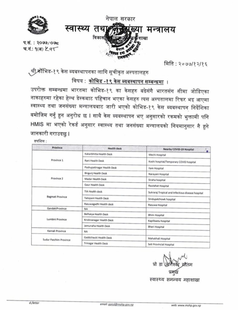 मन्त्रालयले नाका जोडिएका हेल्थ डेस्कबाट नजिक पर्ने १४ वटा अस्पतालमा रिफर गर्न समेत निर्देशन दिएको छ ।